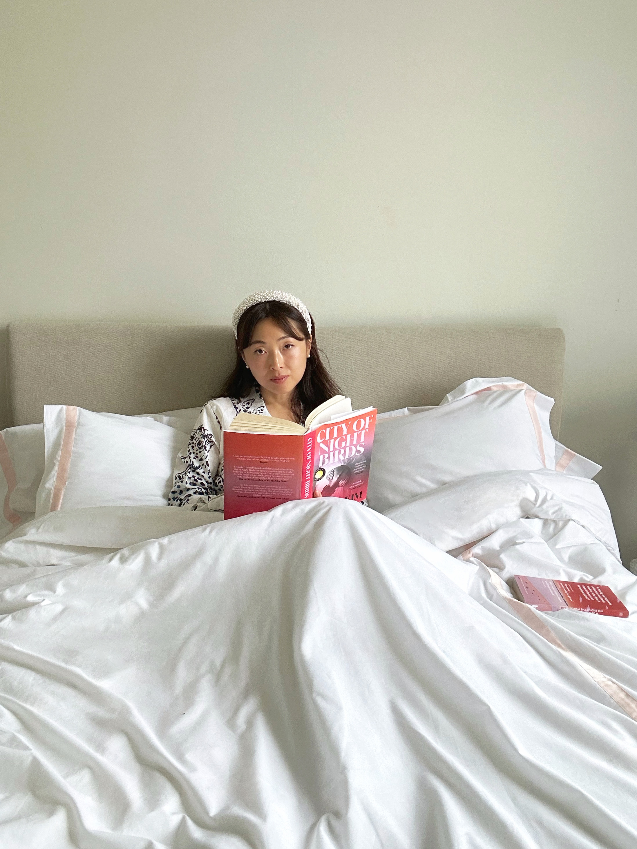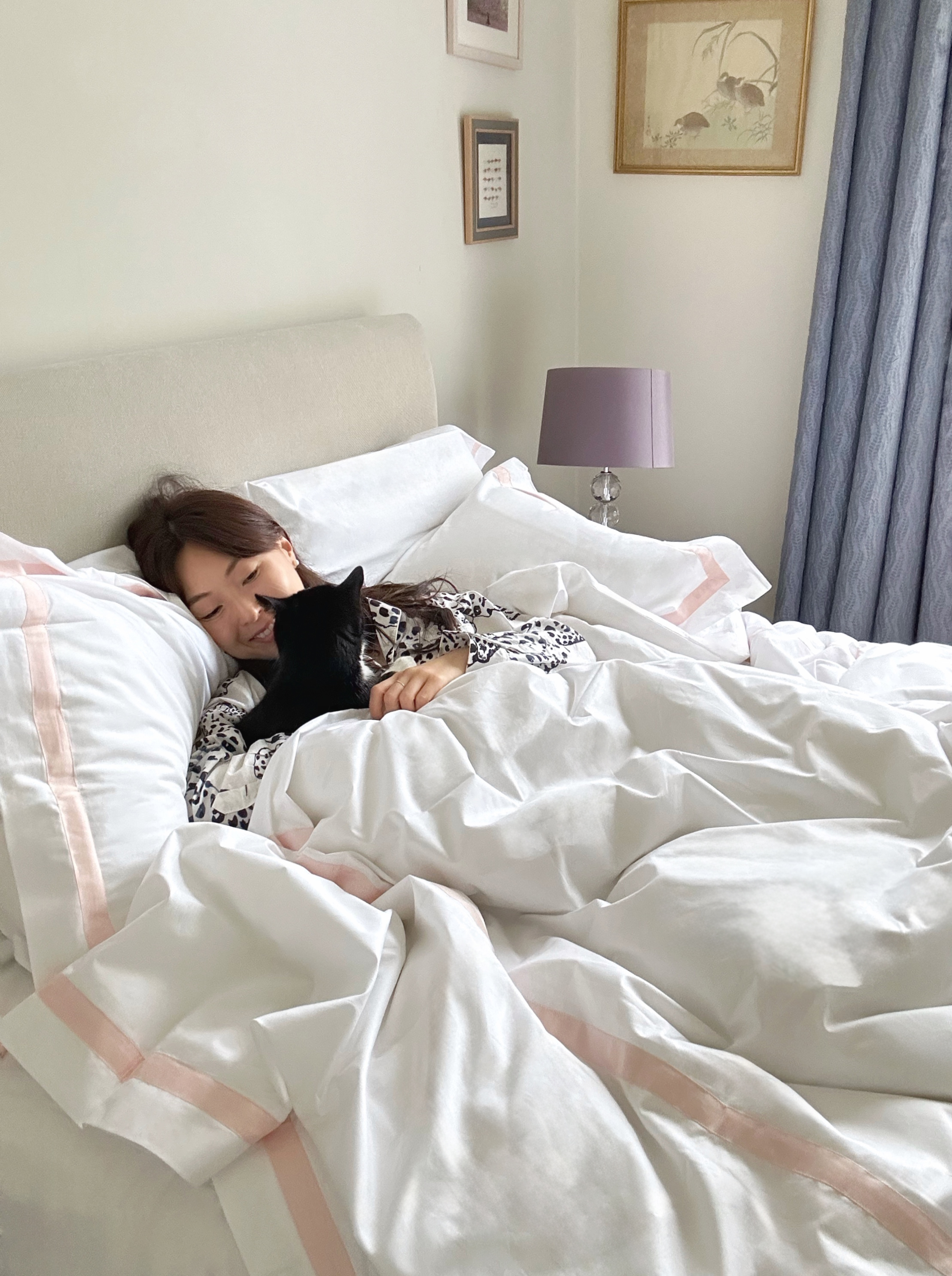 Soft, airy, beautiful bedding is an absolute must for my reset. To be honest, my bed is also where I write (how Proustian of me!), read books, prepare my pointe shoes, and cuddle with my cats; it’s where almost all my important activities take place. So my bed is very important to me, and SFERRA collections make it feel simply luxurious, not just quotidian. I also always wear tailored pajama sets (Desmond & Dempsey is a favorite brand), because it’s uplifting to be both comfortable and polished at home. Finally, I keep candles and fresh flowers on my nightstand.