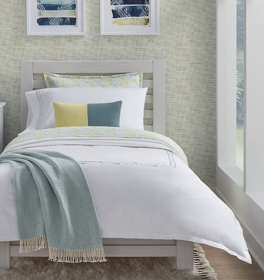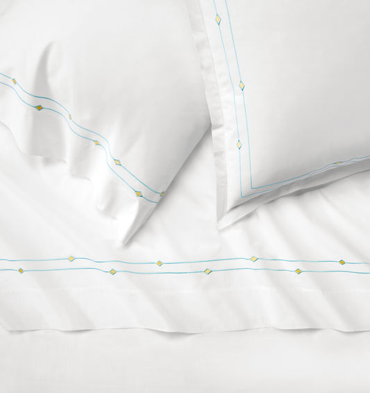 Discover the Diamantini bedding collection. Featuring a satin-stitch double border of aqua, accented by yellow diamond details, this luxury white duvet cover, shams, pillowcases and bed sheets are made in Italy and finished on cotton percale.