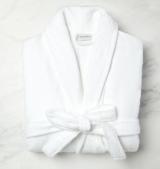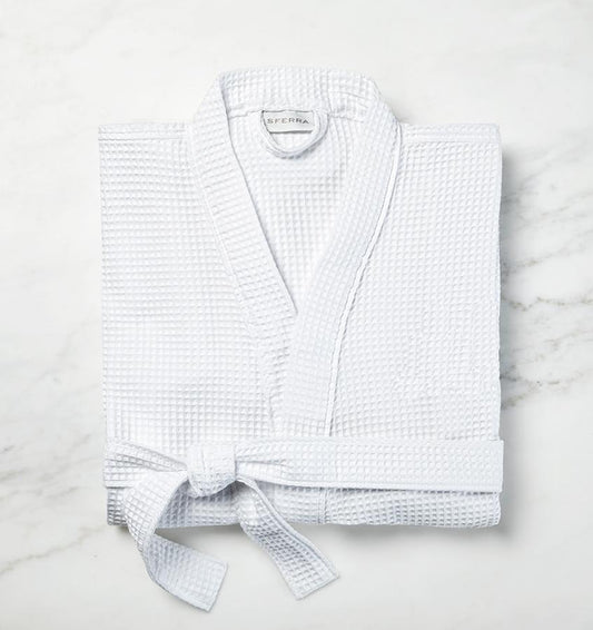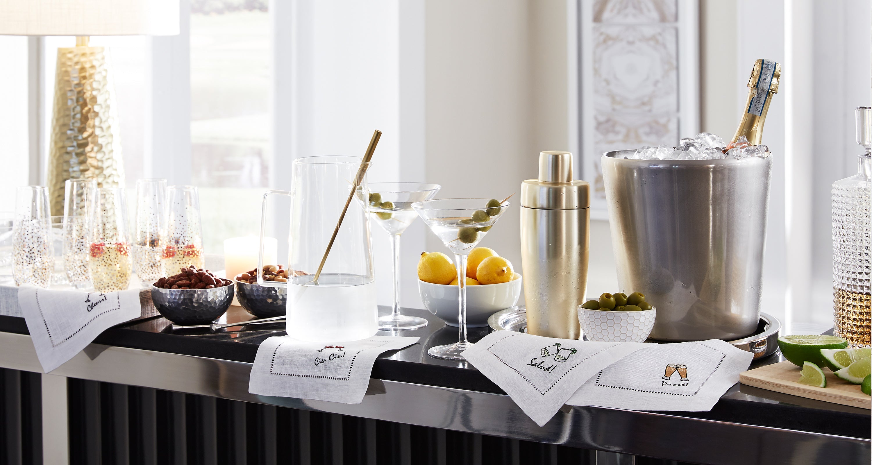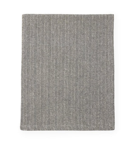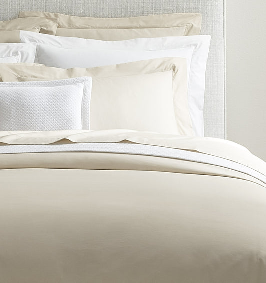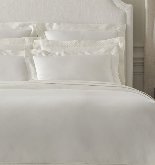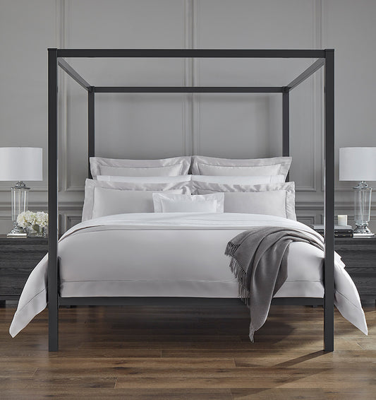 A breakfast tray in morning light on sateen cotton SFERRA bedding.