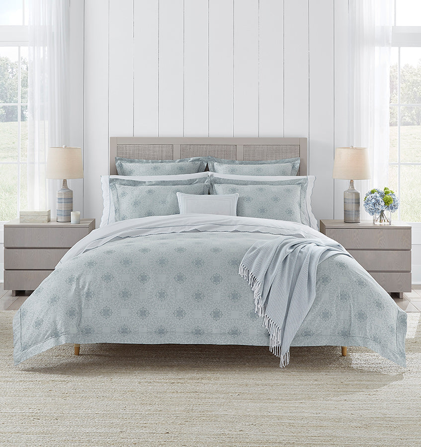Echoing the exquisite craftsmanship of crocheted lace, Marini is an elegant take on a traditional craft. Impeccably woven with fine, yarn-dyed threads in an all over lace pattern, Marini’s hydrangea tones create the perfect gem for spring. Features a punto ombra hem—a subtle relief along the flange that creates a clean, visual detail and a durable finish.