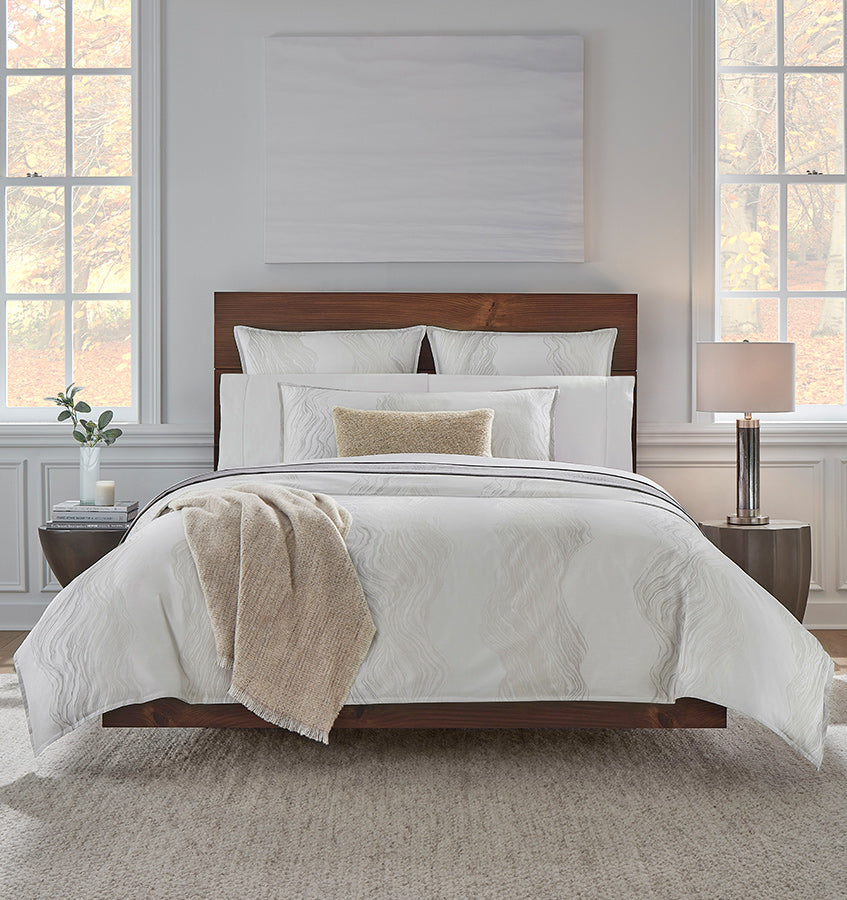 Inspired by the linear patterns found in our natural landscape, Melba’s design features organic lines rendered on smooth sateen jacquard. The subtle striation of taupe and grey tones create a muted look of sophistication and depth.