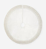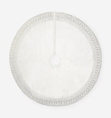 This stocking and tree skirt collection dazzles with scalloped beadwork and metallic embroidery on a snowy velvet base. The tree skirt can be personalized above the patterned border with a monogram.