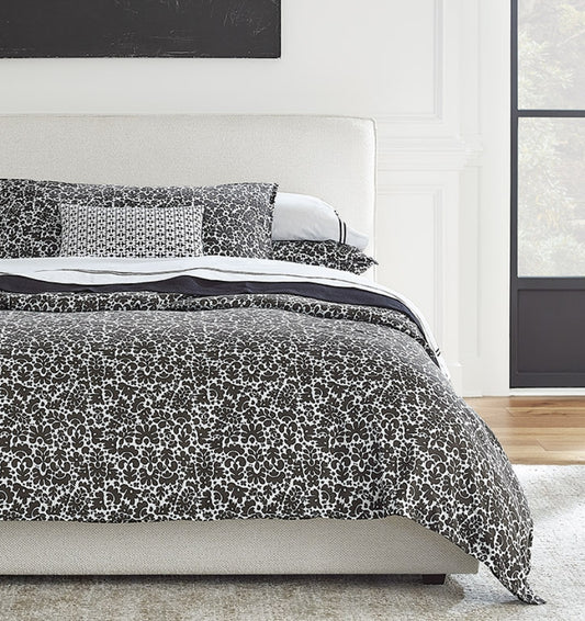 Crafted from a luxury cotton sateen, the Nori Collection features a black and white print on long-staple cotton bedding. This black and white duvet cover and pillow shams are made in Italy and finished with a plain hem.