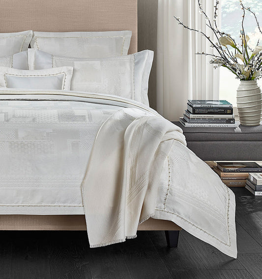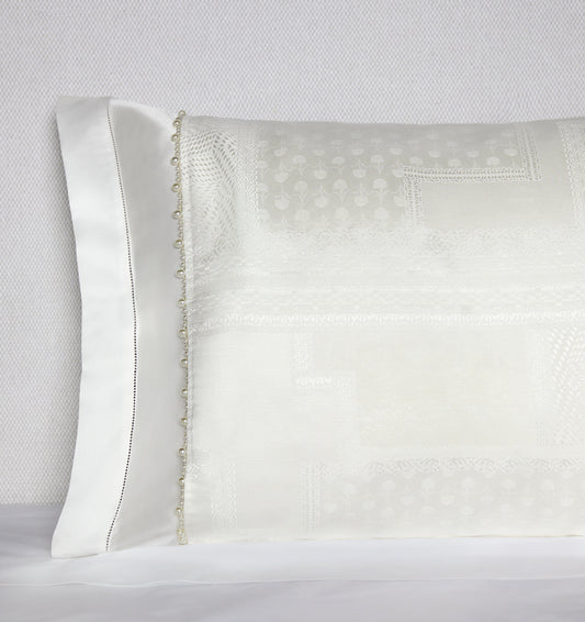 Inspired by the delicate hand-stitched luxury of European lacemaking, Regina weaves together silk and linen yarns into an exquisite jacquard pattern. Panels are layered with lace to create a subtle patchwork effect, and are finished with a lovely pearl trim that gently reflects the lucence of this candlelit colorway. Limited Edition of 5.