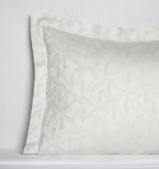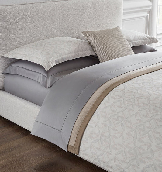 Shop the Terracina Collection. This luxury bedding collection is an Italian-woven sateen jacquard with an all-over leaf pattern in pale green and aquamarine yarns. The patterned duvet cover and shams are crafted from long-staple cotton.