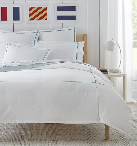 Shop the Tratto Collection. The embroidered percale bed sheets, duvet cover, pillowcases and shams feature a double border of blue satin-stitching on a white long-staple cotton sheets. Shop SFERRA's luxury percale bedding.