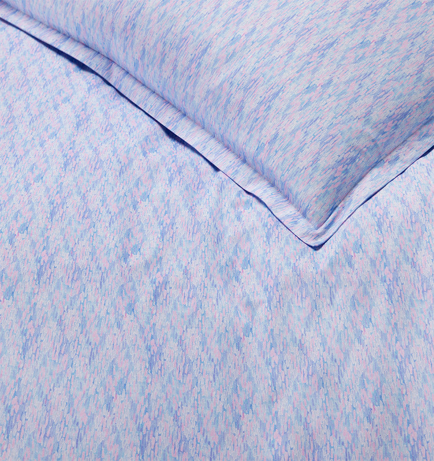An ornate bedding collection woven in Italy from whimsical coloration, Alessia’s printed percale breathes new life into the timeless herringbone pattern. This reimagined interpretation unfurls as a mesmerizing canvas, where each brushstroke—hand-painted and imbued with an impressionist feel—weaves a story of artistry and elegance.