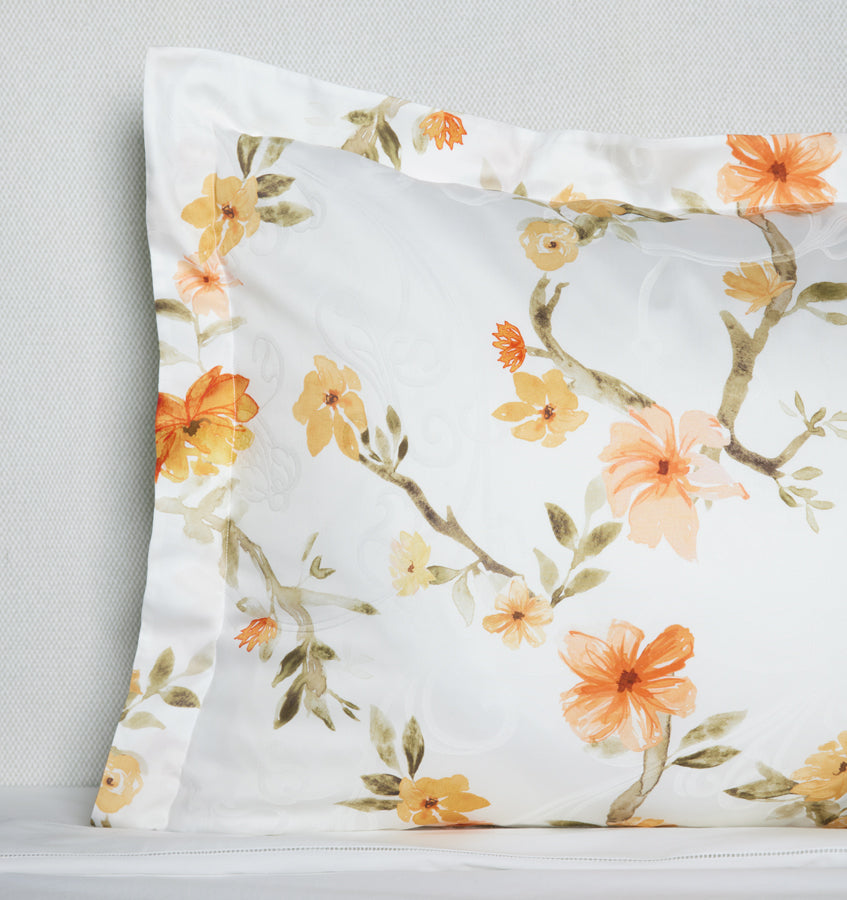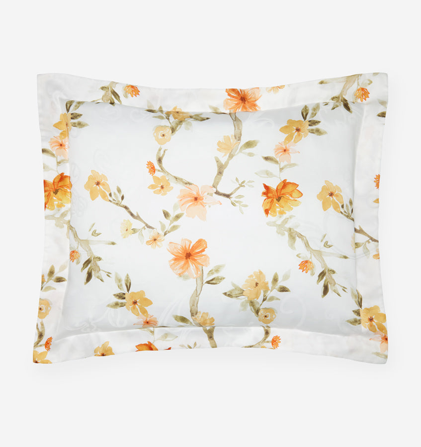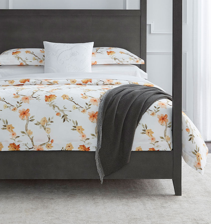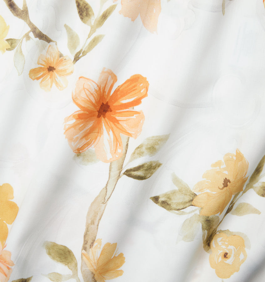 An exuberant reimagining of an archive collection, Biana’s peach-hued dogwood floral blooms on a sateen jacquard base for a look of optimism and romance.