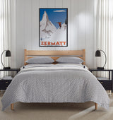 The unique character of Caselle emerges from its meticulously organized layout, where carefully placed tiles and geometric shapes intersect with the fluid, freeform lines of hand-drawn artwork. This minimalist pattern, rendered in a soothing palette of navy and