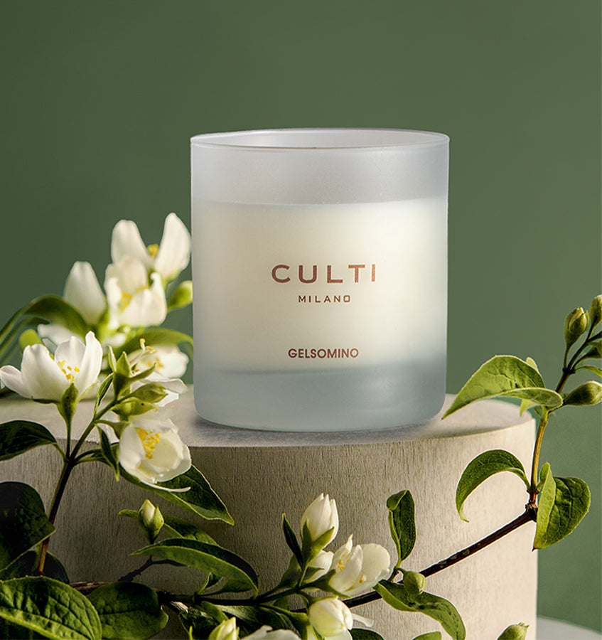 Exclusive design objects characterized by clean lines and elegant simplicity, which enhance every room with soft, dreamlike atmospheres. The fragrances of the candles evoke different worlds that can be blended together harmoniously in a dance of scented light. Gelsomino: Just around the corner, a sudden encounter with a wall covered in climbing jasmine. A fresh floral explosion that is intense at first but melts softly away, maintaining its steadfast persistence.