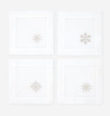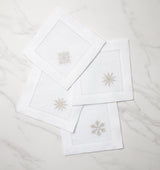 The Fiocco Cocktail Napkins come in sets of 4 with 4 different embroidered snowflakes.