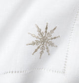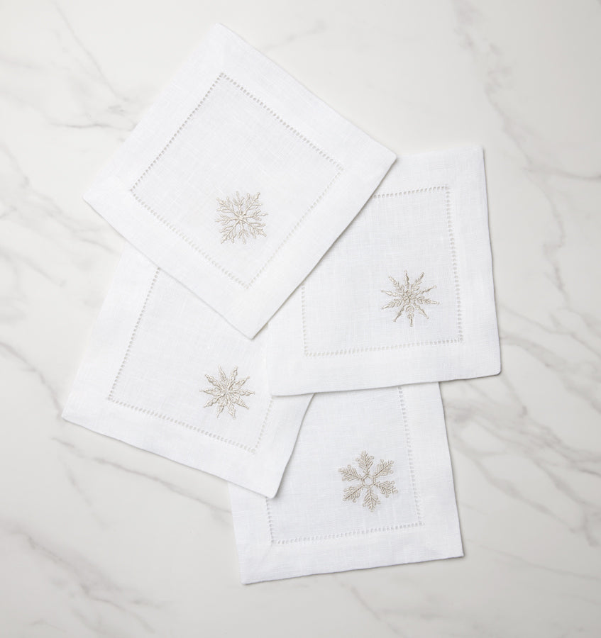 Silver embroidered snowflakes sparkle on this set of linen cocktail napkins, capturing wintertime wonder and celebration.