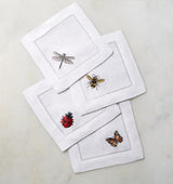 Insetti is our delightfully animated cocktail napkin with the most endearing insects embroidered on fine, white hemstitched linen to add energy and whimsy to your table.