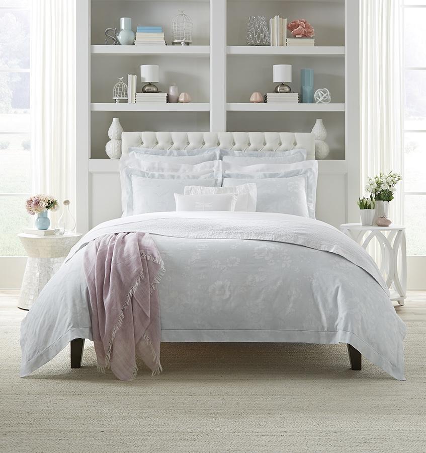 Inspired by spring florals, Lizana weaves together soft colors into a sateen jacquard to display organic movement that is subtle like a dusting of frost. Shortened flanges and light, near-neutral colors keep the look modern. Coordinates well with our Classico linen sheets.