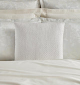 Delicate boucle threads are embroidered in an all-over textural pattern on this luxurious decorative pillow. Silvery details against a white linen base adds a layer of sophistication.