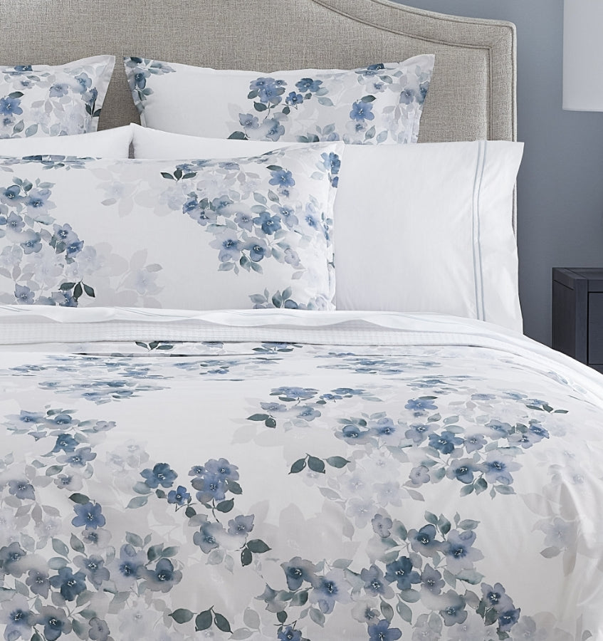 Afternoons in the garden inspire Primavera, an enchanting collection crafted from soft cotton percale. Gentle hand- painted brushstrokes bring to life a scene of radiant blue florals, softened by sunlight and veiled under shadows.