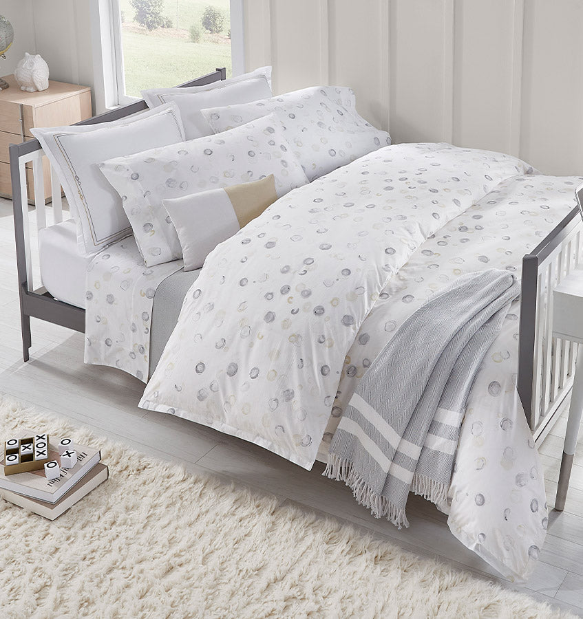 Brushed-on shades of grey and taupe create an all-over pattern on a Punti's indulgently soft and breathable percale base. The coordinating Squillo embroidered collection is tied together with two lines of grey and taupe, which form whimsical loops as they dance around the four sides. Together, the collections add a playful modernity to the classic polkadot, elevating the bedroom while infusing it with a subdued sprightliness.