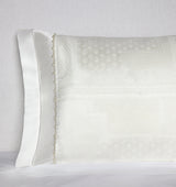 Inspired by the delicate hand-stitched luxury of European lacemaking, Regina weaves together silk and linen yarns into an exquisite jacquard pattern. Panels are layered with lace to create a subtle patchwork effect, and are finished with a lovely pearl trim that gently reflects the lucence of this candlelit colorway. Limited Edition of 5.